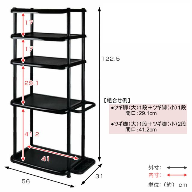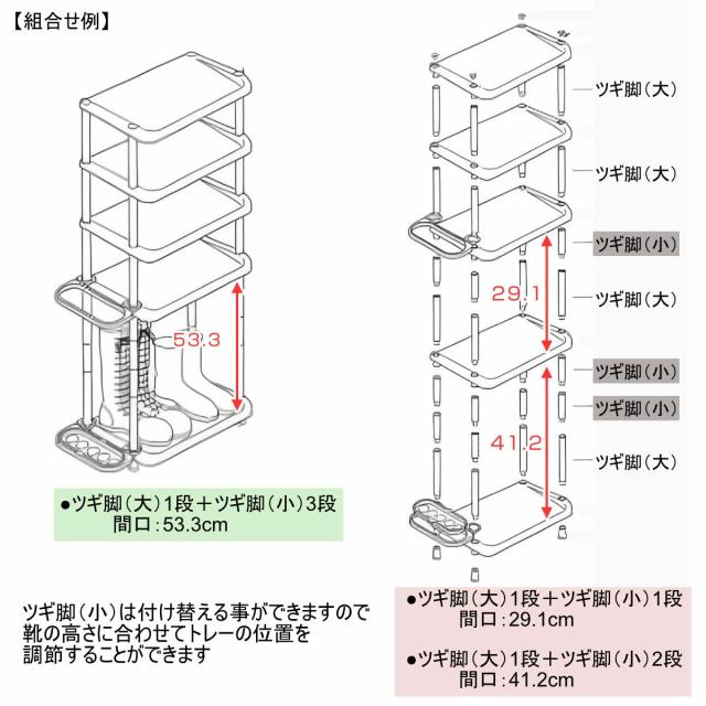 ツギ脚の付け替えで棚の高さを簡単に調整できます。靴の高さに合わせて間隔を変えられるため、長靴やロングブーツもすっきり収納できます。