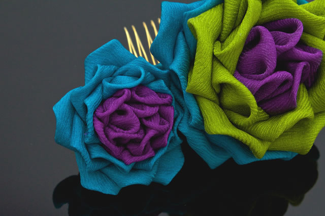 色鮮やかな生地によるバラの花のような花のデザインです。