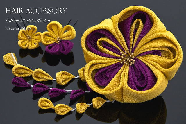 成人式 髪飾り 成人式の髪飾り つまみ細工 3点セット 山吹茶 イエロー 紫 梅 ぽりちりめん コーム 簪 ヘアアクセサリー 卒業式 日本製 和装