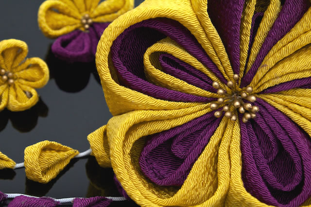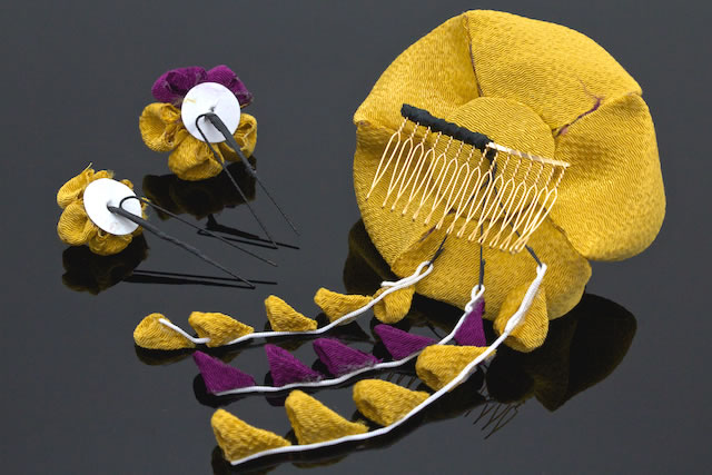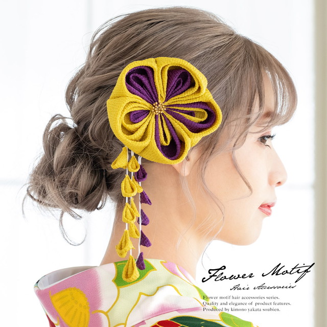 着物のヘアスタイルにおすすめな、つまみ細工の髪飾りです。