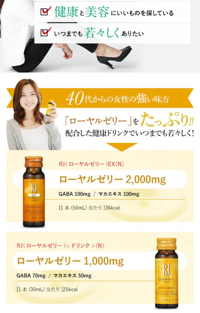 ●1本に1000mgのローヤルゼリーと、GABA、マカ、ビタミンC・Eなど、ライフステージをサポートする成分を配合したドリンクです。