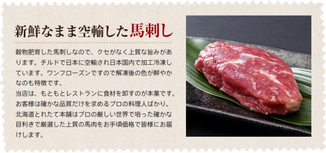 カナダ産の馬刺しを切り出す際に出る”規格外サイズ”のため『格安』になっております。カナダ産、ポーランド産、ウルグアイ メキシコ産 ブラジル産の赤身馬刺しが約300g(2−6本)真空パック。1パックが約1〜2人前分量ですので、使い切りに近いサイズになっておりロスも少なくたいへん経済的です。また1パックが小さいので流水解凍でもスグに提供できます。カナダ産の穀物肥育した馬刺しなので、クセがなく上質な旨みがあります。またワンフローズンですので解凍後の色の鮮やかさがよいのも特徴です