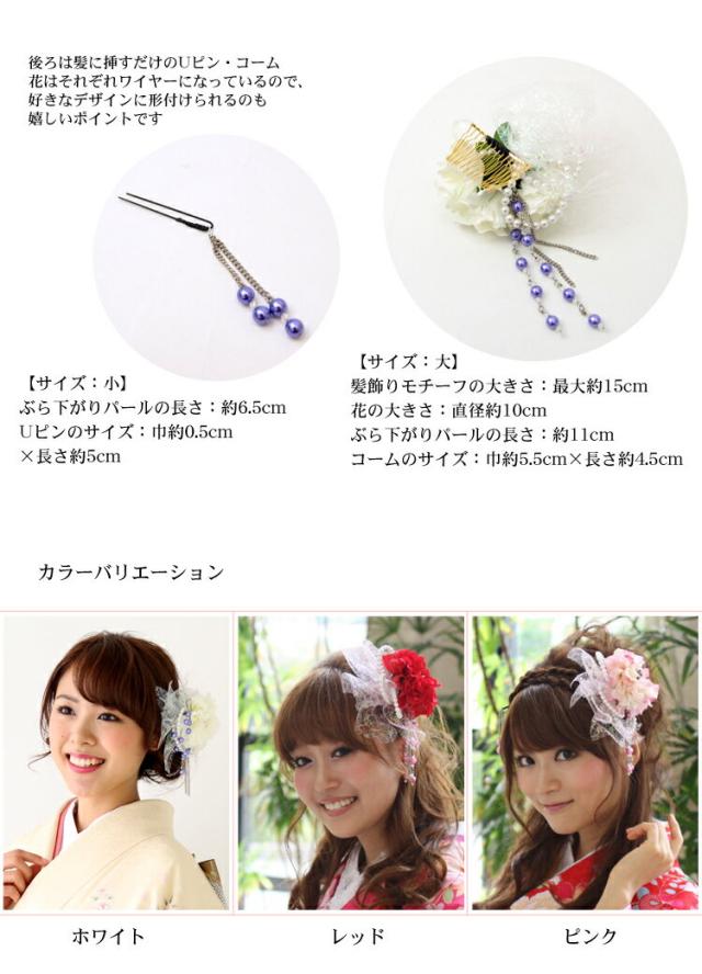 | サイズ | 【サイズ:大】 髪飾りモチーフの大きさ:最大約15cm 花の大きさ:直径約10cm ぶら下がりパールの長さ:約11cm コームのサイズ:巾約5.5cm×長さ約4.5cm 【サイズ:小】 ぶら下がりパールの長さ:約6.5cm Uピンのサイズ:巾約0.5cm×長さ約5cm |