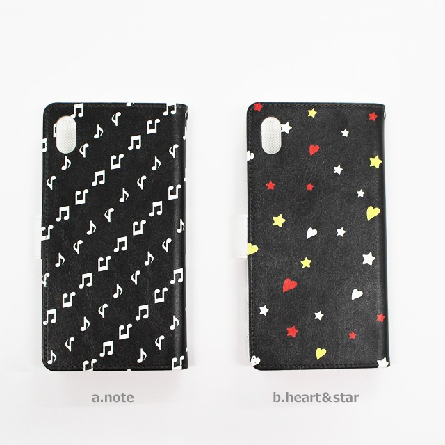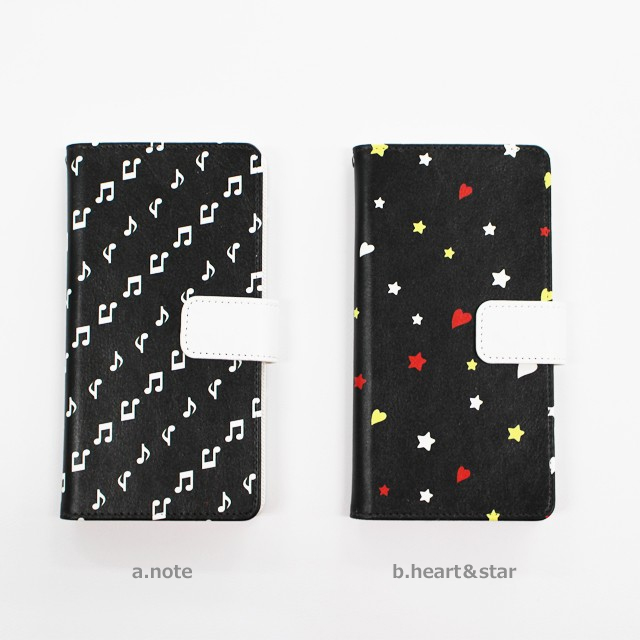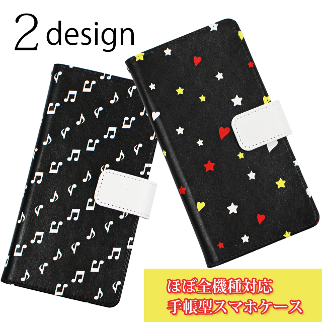 黒い背景に、小さな音符やハートと星をちりばめた手帳型スマホケースです。