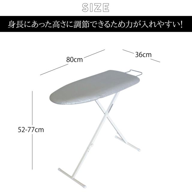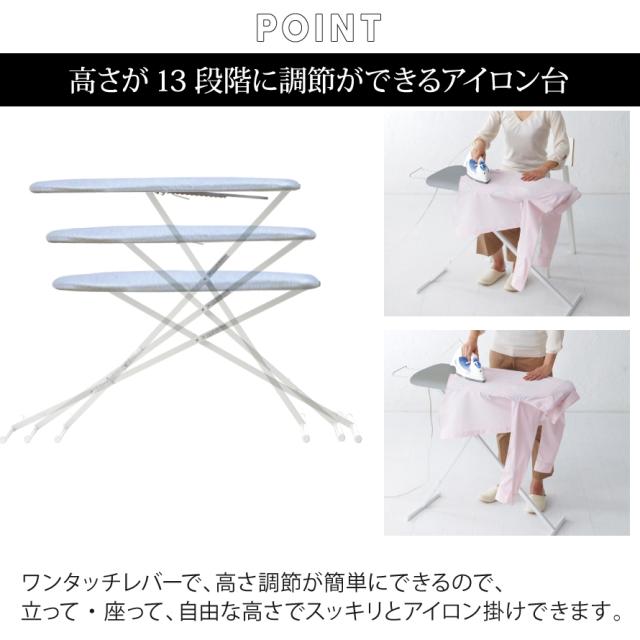 ワンタッチレバーで、高さ調節が簡単にできるので、立って・座って、自由な高さでスッキリとアイロン掛けできます。