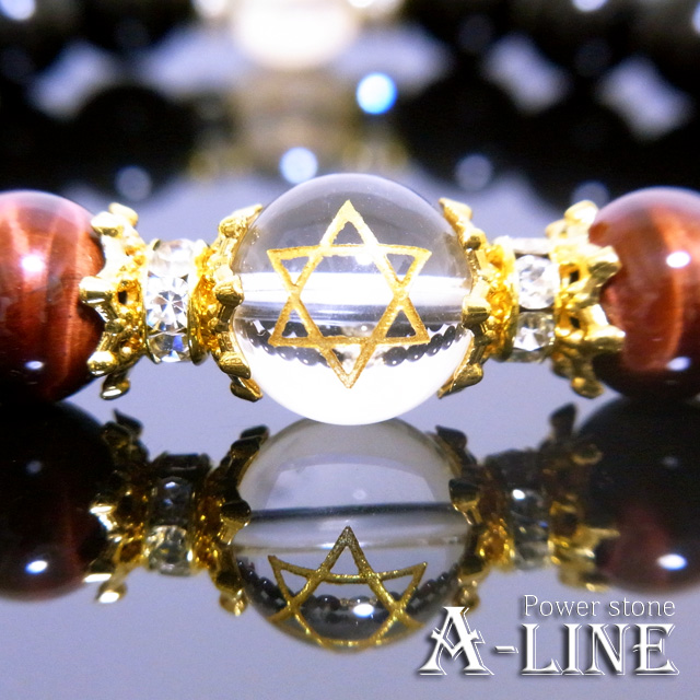 太古から宇宙のエネルギーを集約すると言われる【六芒星】を金彫りした水晶12mmを使い、世界三大金運石でのAAAレッドタイガーアイ10mmとゴールデンオーラに更なるエネルギーを注入!
