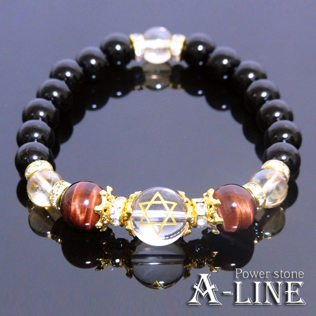 パワーストーン ブレスレット 金彫り六芒星水晶12mm&AAAレッドタイガーアイ10mm・オニキス8mm PW-2933
