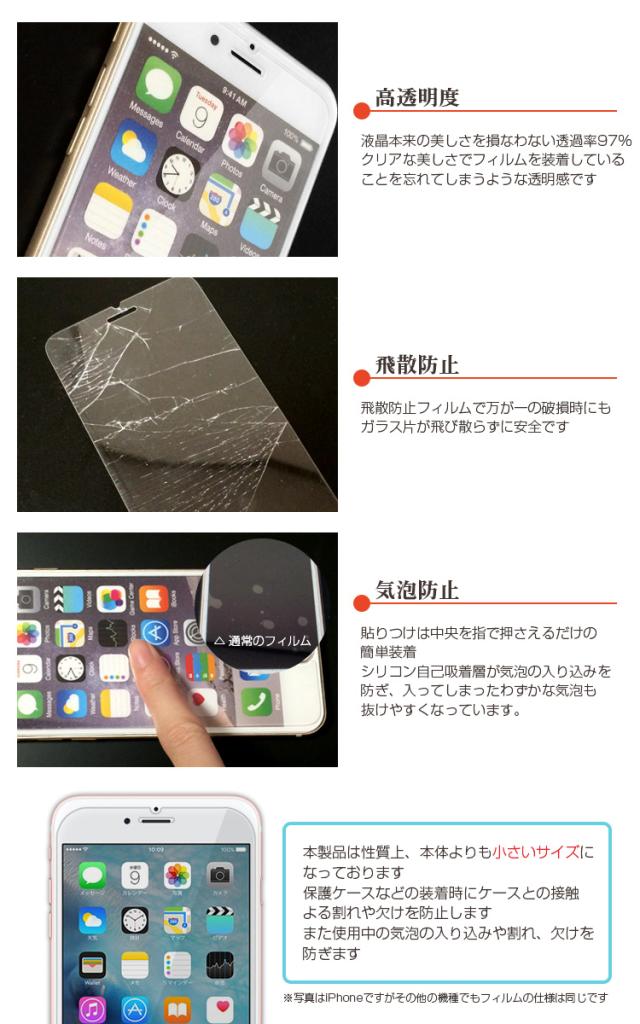 ※使用中や保護ケース等の装着時の接触によるの気泡の入り込みや欠けを防止するため、フィルムは本体よりも小さめのサイズで出来ております。
