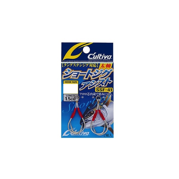 コンパクトシルエットジグ対応!リアフックにも最適。TGエッジなどコンパクトシルエットのメタルジグに最適サイズな極短アシストフックです。単に短いだけでなく、フックには高強度かつ軽量なフラットアイ「SJF-41」を採用。本気でジギングターゲットに臨むことを可能にします。小型ベイトについたマダイを筆頭に、青物全般にどうぞ。