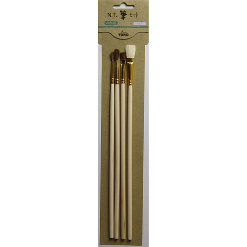 羊毛(白)と馬毛(茶)を使用していますので、各種塗料や用途により使い分け下さい。平筆(大)、平筆(中)、丸筆(中)、丸筆(小)の4組です。