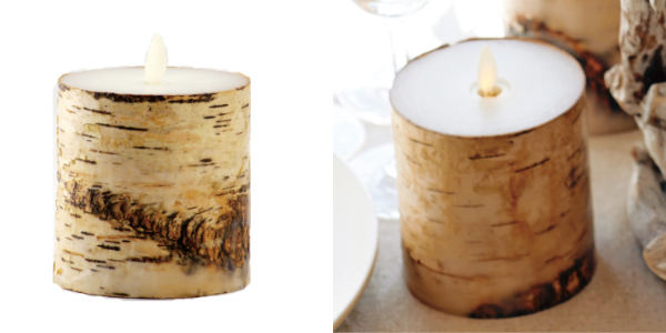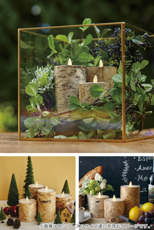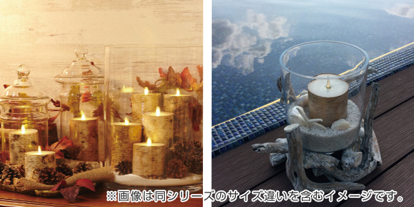| 安心・安全 見た目は本物のキャンドルのようですがLEDで再現した炎のため、触ったり倒したりしても大丈夫です。安心・安全にお使いいただけます。 | 白樺の木が雰囲気づくりに 天然の白樺の皮を周りに巻いているので、ナチュラルで上質な雰囲気が空間を引き立てます。 |