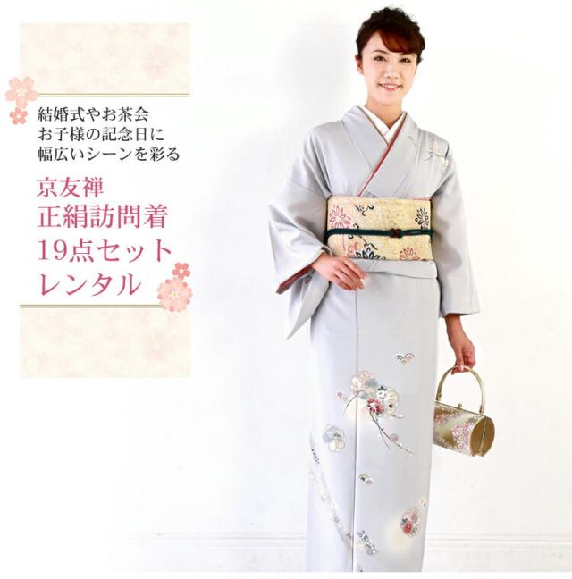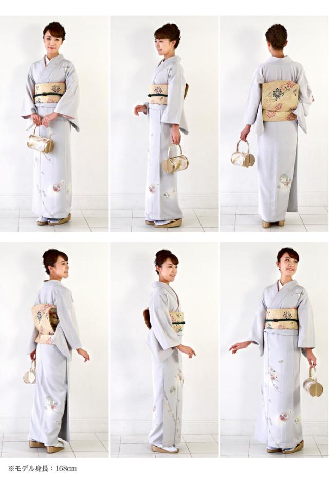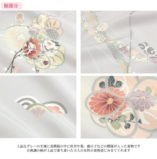 訪問着 レンタル 19点フルコーディネート 披露宴 「グレー地に花取り牡丹・菊・鹿の子」