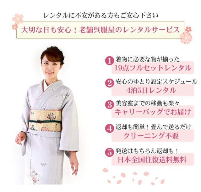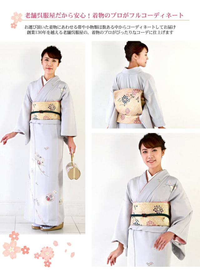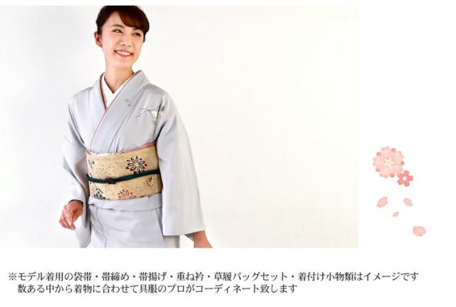| ※モデル着用の袋帯・帯締め・帯揚げ・草履バッグ・小物類の色、デザインはイメージです。 数ある中から呉服のプロがコーディネートしてお届け致します。 | |||