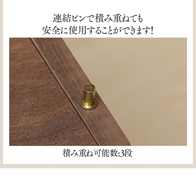 底面・天面に連結ピンをさすことで、積み重ねて使用することが可能です。