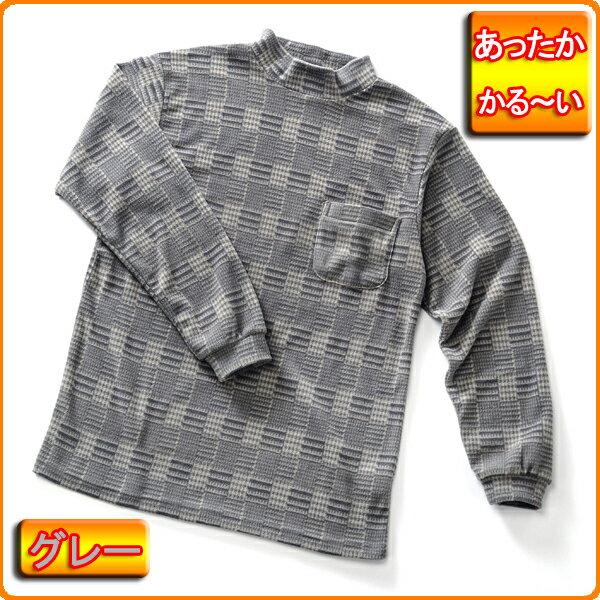 メンズ 紳士 あったか 起毛 プリント フリース ハイネック 【グレー】 メール便配送 冬 の インナー や部屋着長袖カットソー