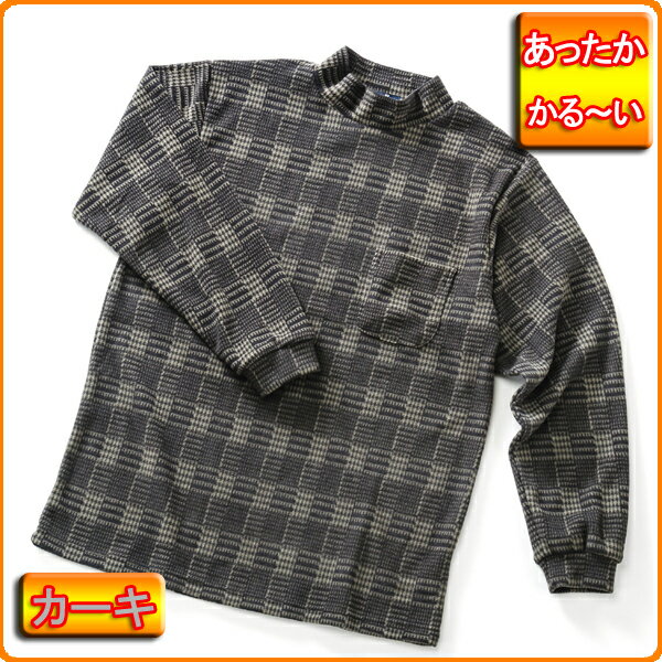 メンズ 紳士 あったか 起毛 プリント フリース ハイネック 【カーキ】 メール便配送 冬 の インナー や部屋着長袖カットソー