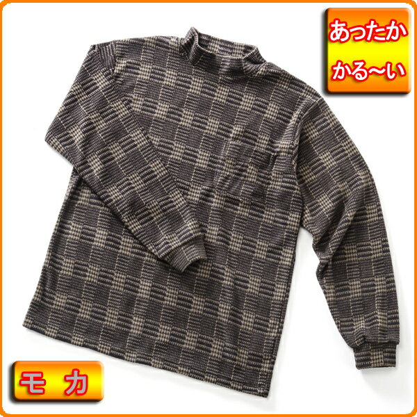 メンズ 紳士 あったか 起毛 プリント フリース ハイネック 【モカ】 メール便配送 冬 の インナー や部屋着長袖カットソー