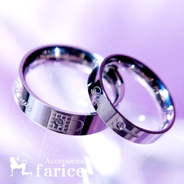 【Love】刻印入り クリアストーン装飾 ロック(錠前) or キー(鍵)デザイン ステンレス ペアリング【5mm幅 or 4mm幅】