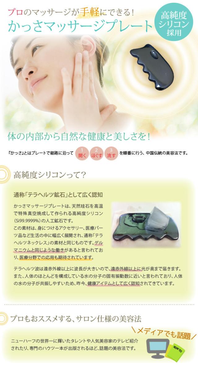 大人気のかっさマッサージプレートに高純度シリコンを採用。中国伝統の美容法・プロのマッサージが手軽にご自宅で出来ます。かっさプレートはフェイスケア以外にも、フットケア、ヘッドケアなど全身に使用可能。また、お風呂に入ってホットケアもおすすめです。