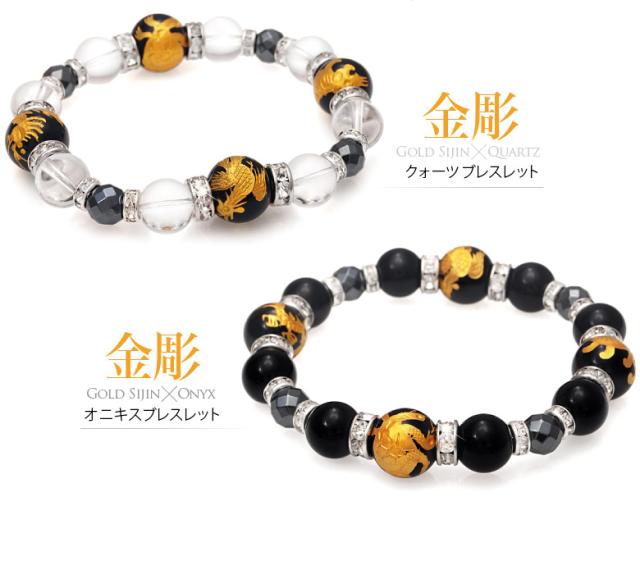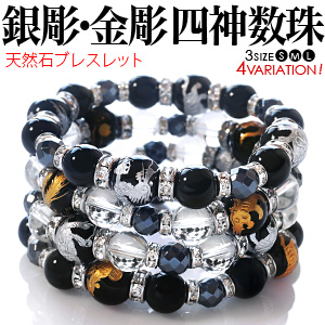 金彫りと銀彫りでブラックオニキスに四神を描いたカービングビーズを使用した男数珠パワーストーンブレスレットです。