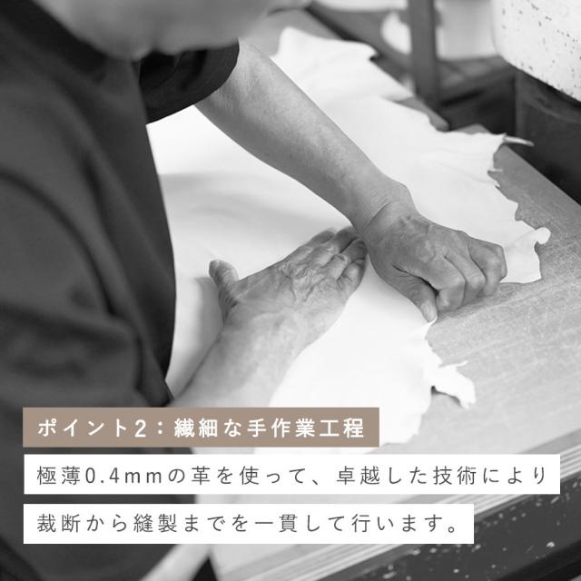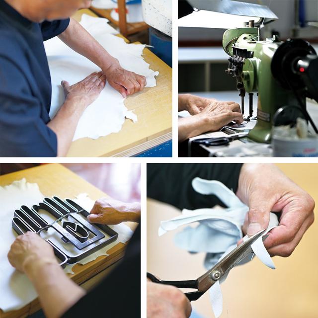 採寸キットでお送りいただいた「手型」をもとに、熟練職人が極薄0.4mm革を一枚ずつ裁断し、縫製まで手作業で仕上げる完全オーダーメイド。