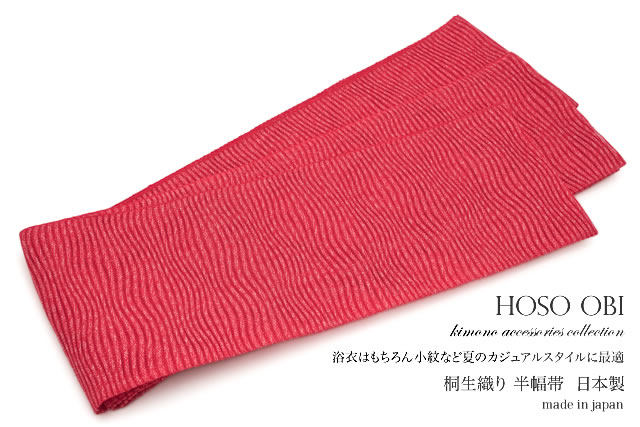浴衣 帯 半幅帯 おび工房 桐生織 チェリーピンク 波 縞 ラメ 絽 メッシュ 夏向け 夏祭り 花火大会 女性帯 細帯 半巾帯