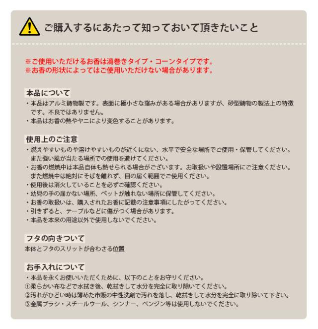 | 注意 | ※本品はアルミ鋳物製です。表面に極小さな窪みや突起がある場合がありますが、不良ではありません。砂型鋳物製法の特徴です。 ※本品はお香の熱やヤニにより変色することがあります。 ※ディスプレイの環境上、実際のカラーが再現できない場合がございます。 |