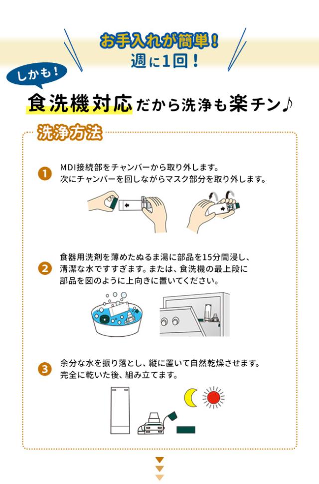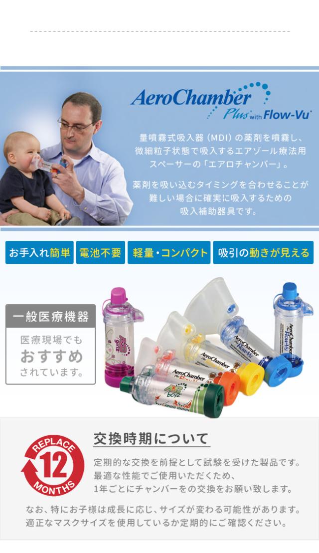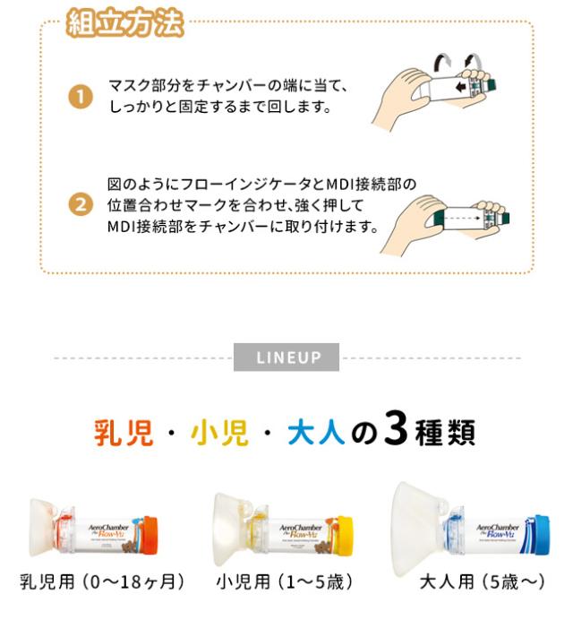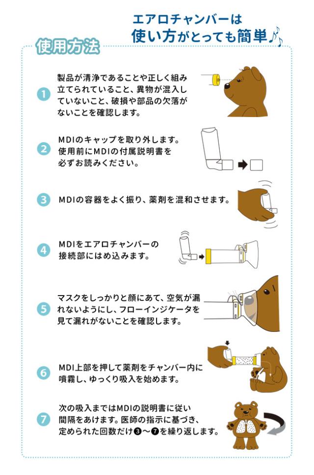 | 使用方法 | 薬剤噴霧後、マスクを当てたまま2〜3回呼吸して下さい。息を吐く場合もマスクを当てたままで大丈夫です。呼吸回数は、フローインジケーターが移動する回数で確認して下さい。フローホイッスルが鳴る場合は呼吸の速度が速すぎますので、ゆっくりと吸うようにして下さい。 |