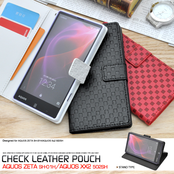 市松模様レザーデザインのAQUOS ZETA SH-01H/AQUOS Xx2 502SH用スタンドケースポーチ。 衝撃やキズなどからAQUOS ZETA SH-01H/AQUOS Xx2 502SHを守ります。また、内部はソフトケースなので着脱が簡単です。 背面を折り返すとスタンドとして使用できるので、動画視聴に便利です。 落下防止に便利なストラップホール付きです。 横開きタイプなので、手帳のように使うことができます。 また、内側に2つのカードポケットとサイドポケットが付いています。