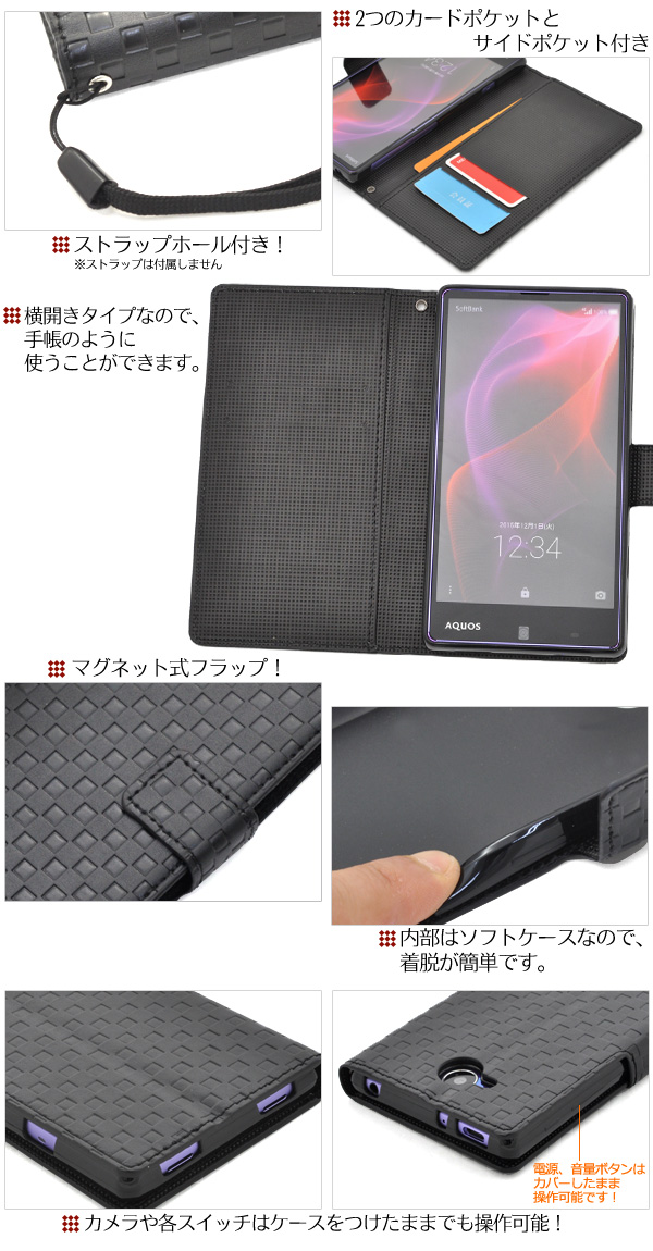 衝撃やキズなどからAQUOS ZETA SH-01H/AQUOS Xx2 502SHを守ります。 また、内部はソフトケースなので着脱が簡単です。 背面を折り返すとスタンドとして使用できるので、動画視聴に便利です。 落下防止に便利なストラップホール付きです。 横開きタイプなので、手帳のように使うことができます。 また、内側に2つのカードポケットとサイドポケットが付いています。 ※AQUOS ZETA SH-01H/AQUOS Xx2 502SHは付属しません。 ※ライセンス商品ではありません ※カードは付属しません。 ※近接センサー・ 指紋センサー穴は開いていません。 | ||||||||||