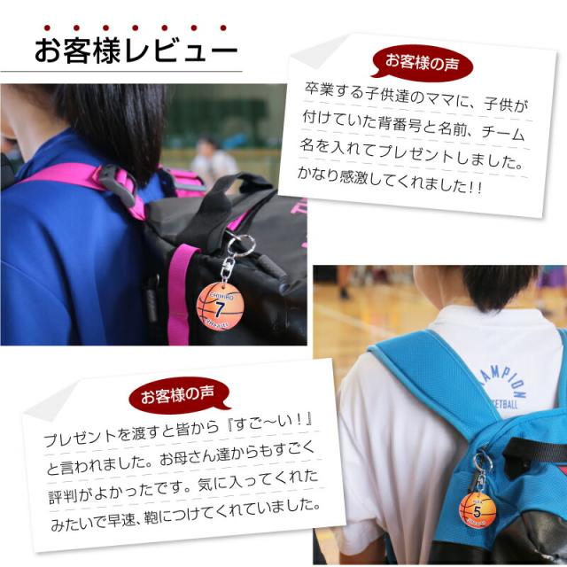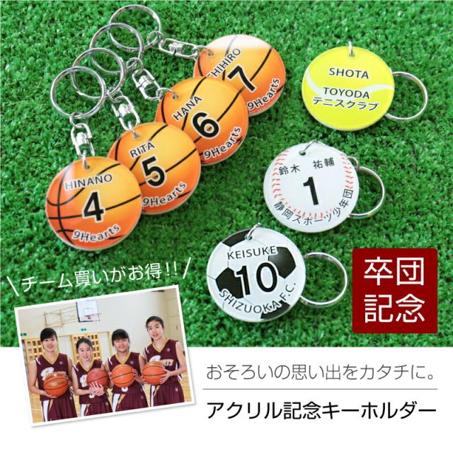 | 卒団・卒部の大切な節目に アクリル記念キーホルダー それぞれのボールをリアルにデザインしたキーホルダー。裏面にはお名前・背番号・チーム名などを刻印することができます。 野球、サッカー、バスケットボール、バレーボール、テニスボール、ゴルフボールの全6種類。 デザイン性だけではありません。 頻繁に使うバッグにもお使いいただける様、品質にもこだわりました。 高性能のプリンターでアクリルの裏面からプリントしているため、文字が消えたり剥がれたりする心配は無用。 くっきりとした文字で小さくても存在感抜群です。 また高い透明度・強度を併せ持った高品質のアクリルを使用しているから、軽いのに割れにくく程よく厚みもあってバッグにつけても安心。 金具は回転式タイプ。 卒団記念品としてたけでなく、 お揃いで持てばきっと、チームの士気が高まり団結力・絆が深まること間違いなし。 大人にも子供にも喜ばれるシンプルなデザイン。 指導し支えてくれたコーチや先生へ・・・ お子さんへ応援と激励の気持ちを込めてプレゼント。 大会、試合を控えた先輩・後輩に士気があがるお守りとして、などいろんなシーンで喜ばれるとっておきのキーホルダーです。 |