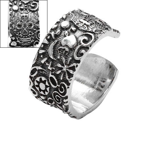 シュガースカルとも呼ばれるポップなメキシカンスカルをデザインしたシルバーイヤーカフです。スカルだけでなく花や太陽、ハートなど全体に細やかな彫刻が施され、密度の濃いデザインが魅力的です。ピアスの様に穴を開ける必要がありません。気軽にオシャレを楽しめる一品です。