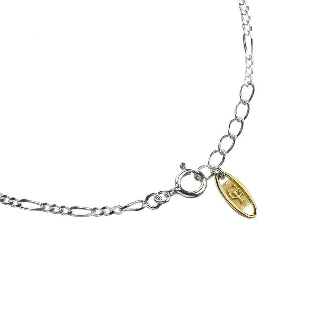 足元をスッキリと見せるシルバーチェーンのアンクレットです。メリハリのあるフィガロチェーンにゴールドのチャームが上品さを引き立たせます。チャームにはK18のゴールドコーティングが施されており、ワンポイントとしての存在感は抜群!FLUIのブランドマークが刻まれています。
