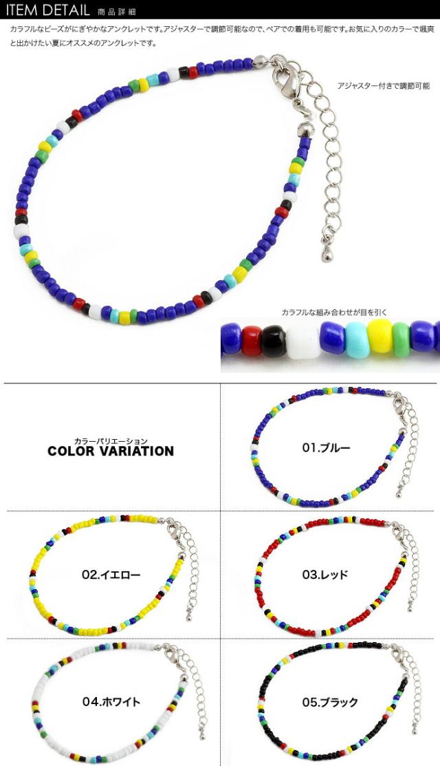 説明 | カラフルなビーズがにぎやかなアンクレットです。アジャスター付きで調節可能なので、ペアでの着用も可能です。お気に入りのカラーで颯爽と出かけたい夏にオススメのアンクレットです。 |
