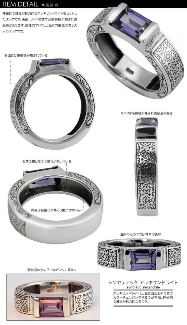 石に当たる光の色でカラーチェンジングする神秘的な輝きが魅力的なシンセティックアレキサンドライト(合成アレキサンドライト)をセットしたリングです。表面、サイドにまで民族模様が施され高級感があります。個性的でいて、上品な雰囲気の漂う大人のリングです。