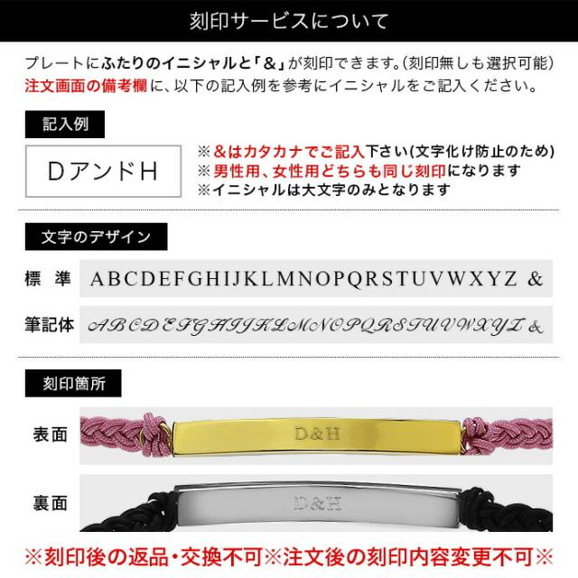説明 | 大切な人と身に着けたい、刻印の出来るペアブレスレットが登場しました。サイズはフリーサイズとなっており、全7色からお選びいただけます。「イニシャル」の刻印で、2人だけのアクセにカスタマイズ出来ます。プレート素材は金属アレルギーが出にくいステンレススチールを採用。特別感のあるアイテムは、贈り物にも最適です。 |