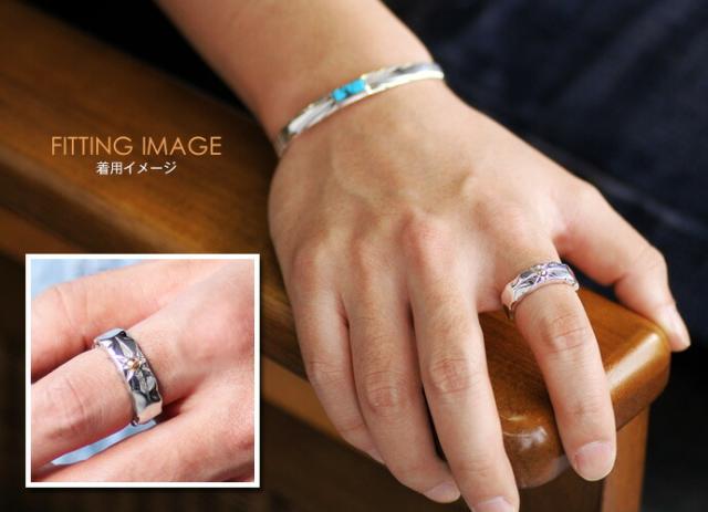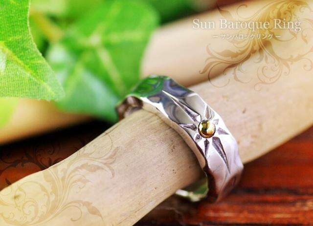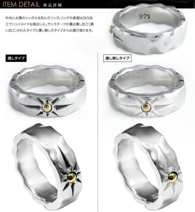 中央に太陽のシンボルを刻んだリング。リングの表面は凹凸加工でハンドメイドな風合いに。サンモチーフの溝は燻し加工(黒い加工)されたタイプと燻し無しのタイプからお選び頂けます。