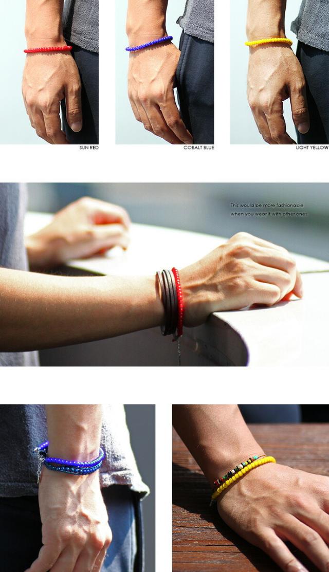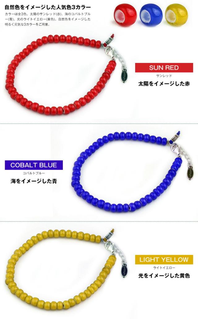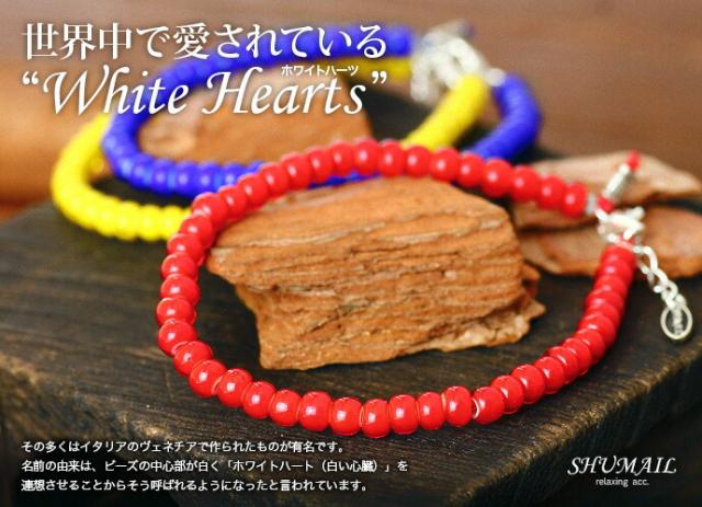 「ホワイトハーツ」を使用したブレスレット。ビーズの名の由来は、ビーズの中心部が白く「ホワイトハート(白い心臓)」を連想させることからそう呼ばれるようになったと言われています。その発色の綺麗なビーズは昔から人気が高くネイティブアクセなどによく使われています。ビーズ幅約5mmとちょうどよいサイズ感も◎。太陽のサンレッド(赤)、海のコバルトブルー(青)、光のライトイエロー(黄色)。自然色をイメージした明るく元気な3カラーは夏気分を上げてくれること間違いなし!強度の高いグリフィンコード(シルク製)を二重に通してあるので丈夫で安心です。