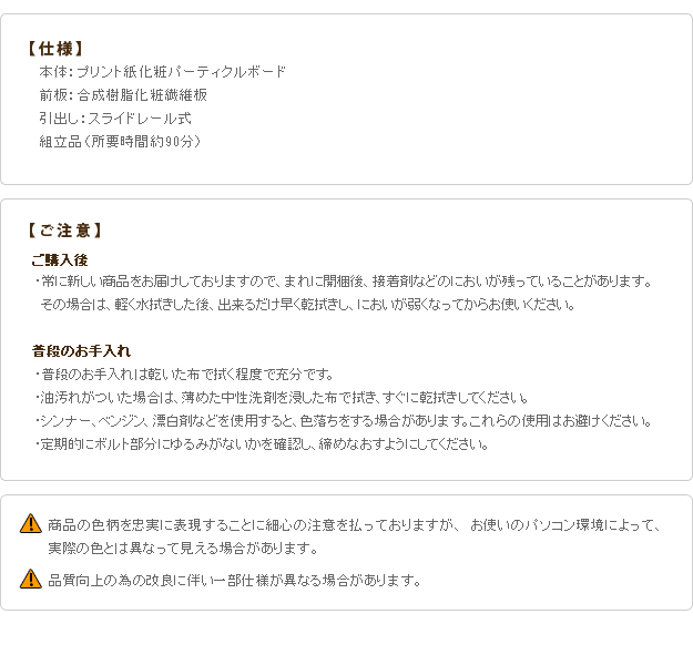 材質:本体-プリント紙化粧パーティクルボード、木口-PVC貼り、前板-合成樹脂化粧繊維板