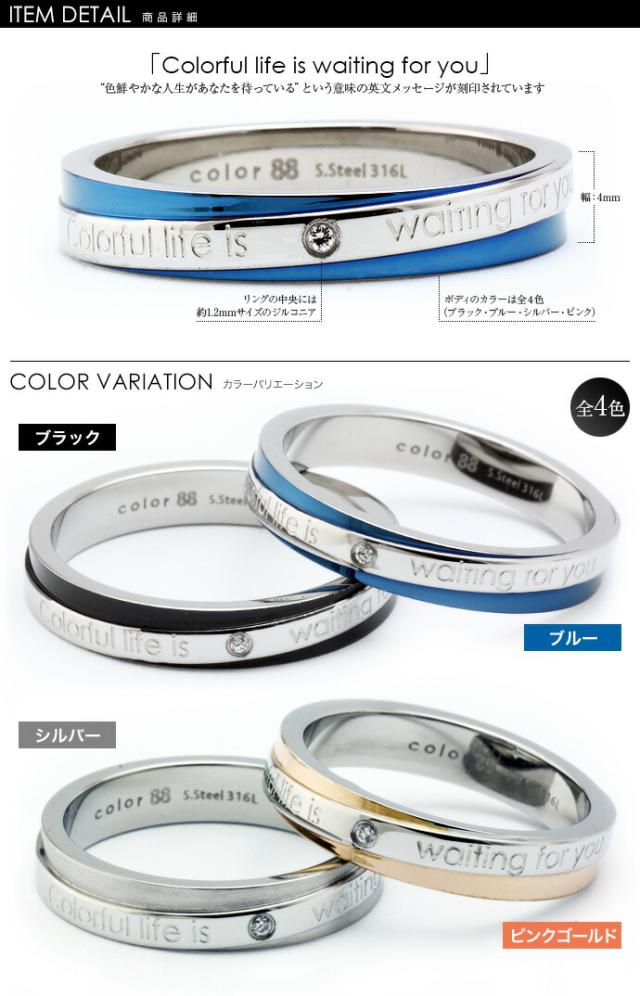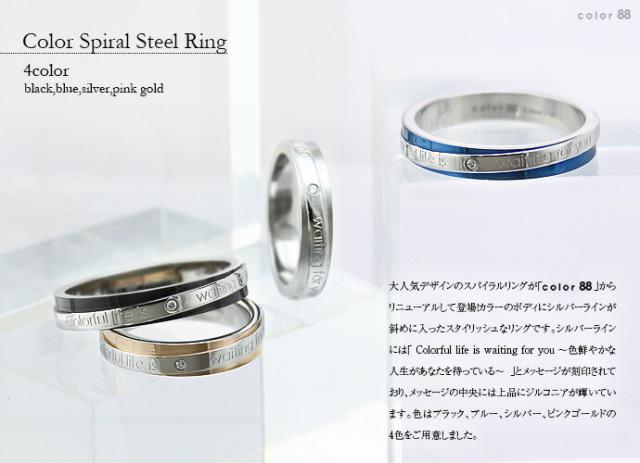 大人気デザインのスパイラルリングが「color88」からリニューアル登場!カラーのボディにシルバーのラインが斜めに入ったスタイリッシュなリングです。シルバーラインには「 Colorful life is waiting for you 〜色鮮やかな人生があなたを待っている〜 」とメッセージが刻印されており、メッセージの中央には上品にジルコニアが輝いています。色はブラック、ブルー、シルバー、ピンクゴールドの4色をご用意いたしました。