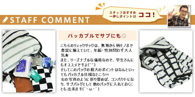 | 備考 | 【メイン開閉】ダブルファスナー 外側/ ファスナーポケット×1 ※ポケッタブル機能有(折り畳み収納) | ||