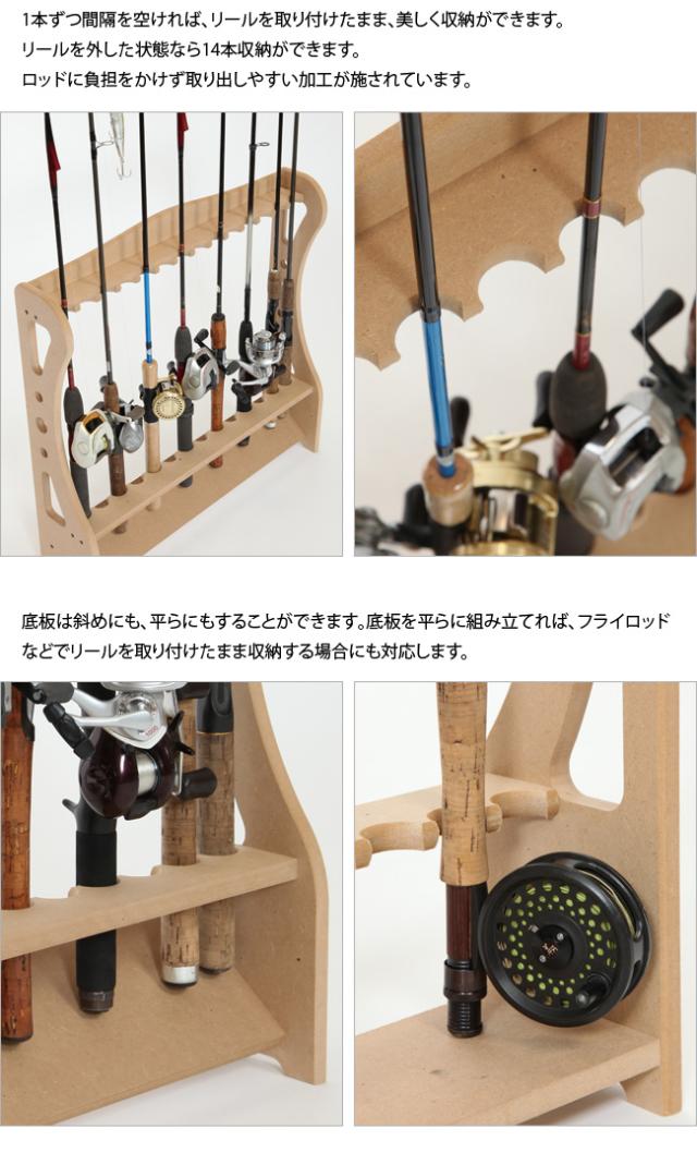 MDF合板で作られた、釣竿に負担をかけず取り出しやすいシンプルな仕上がりの棚で、リールを外した状態で14本のロッドが収納できます。