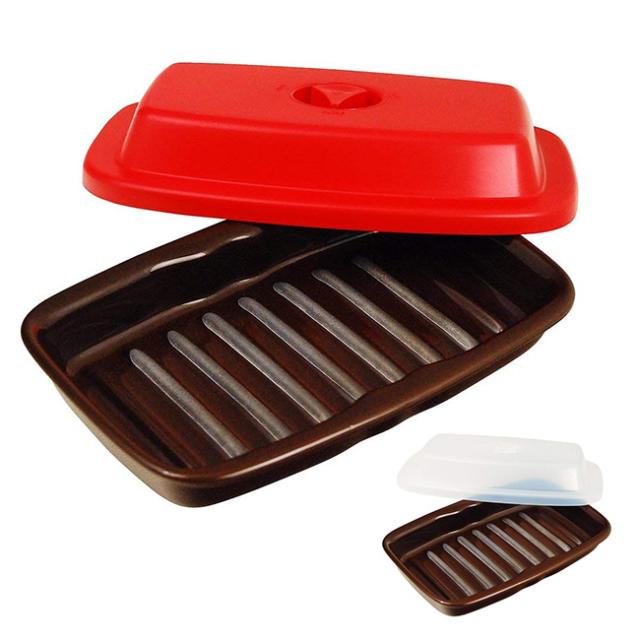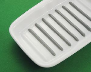 プレートの底面に施した電磁波に反応する特殊な発熱体で食材を焼き調理。発熱体の熱を直に伝える事で、今までの電子レンジ調理ではできなかった味が楽しめます。フタが平らなので重ね入れもOK。ウェーブとアーチを組み合わせた形状の底面が調理をした時に出てくる油や水分をプレートの隅へと流し、おいしくヘルシーに仕上げます。器としての機能も兼ね備え、調理したまま食卓に運んでも違和感無く溶け込む洗練されたフォルム。