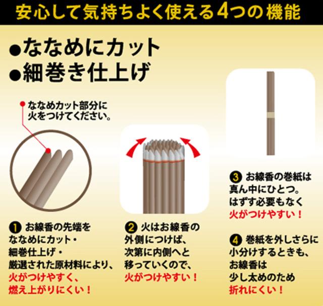 お線香の先端をななめにカットして、細巻仕上げになっています。厳選された原材料により、火をつけやすく、燃え上がりにくいのが特徴です。お線香の束の外側に火がつけば、次第に内側へと移っていきます。