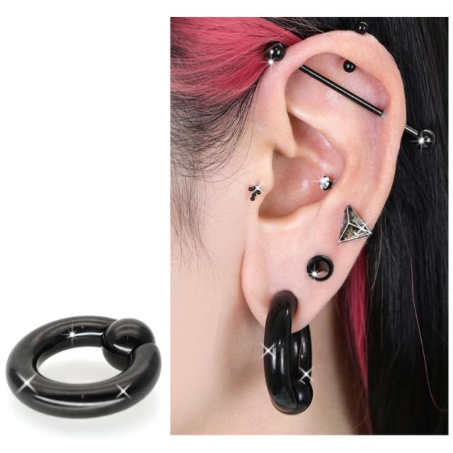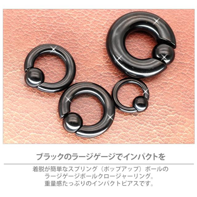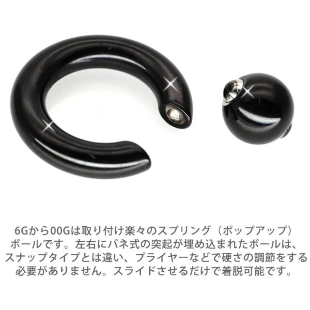 ボールクロージャーリングのラージサイズ(8G〜00G)は、取り着けラクラクのスプリング(ポップアップ)ボールスタイル。左右にバネ式の突起が埋め込まれたスプリングタイプです。スナップタイプとは違い、プライヤーなどで硬さの調節をする必要がありません。スライドさせるだけのワンタッチ装着なのでとても手軽で簡単です。ジュエリーの素材はもちろん全てサージカルステンレス。金属アレルギーが起きにくい医療用ステンレスサージカルステンレス素材をPVD(IP)コーティング加工」にて着色。いわゆる「メッキ処理」とは違い、密着性、表面耐久性に優れています。長期に渡る使用により色が薄くなることはありますが、メッキに見られるような剥がれはありません。