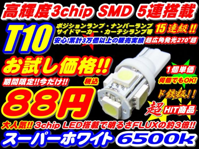 税込88円!!期間限定ド定番★高品質3倍光SMD 15連級 T10/T16ウエッジ LED ポジション ナンバーランプ サイドマーカー ウインカー 3チップ