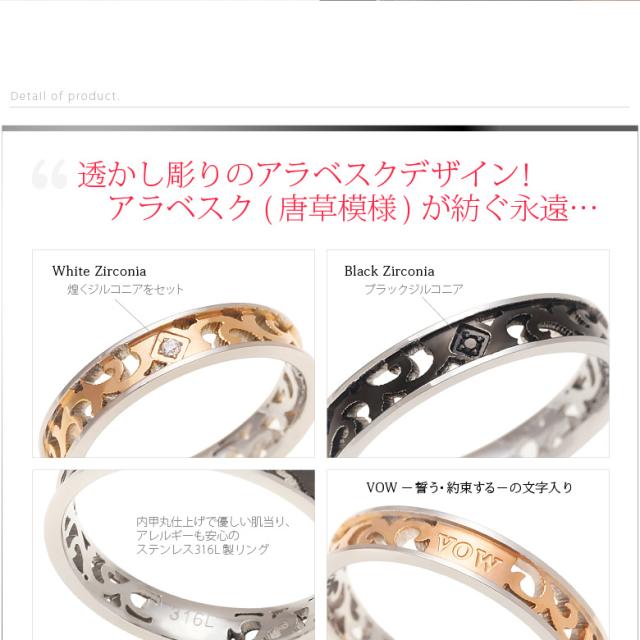 透かし彫りのアラベスクを中央にデザインしたステンレスペアリングです。アラベスク(唐草模様)は繰り返し続くことから無限を意味します。アクセントにキュービックジルコニア(人工石)をセット。さらに「VOW -誓い-」のメッセージを刻みました。カラーコーティングで仕上げてあるので一目でわかるアラベスクパターンはアクセサリーをお揃いにしたいカップルにおすすめです。
