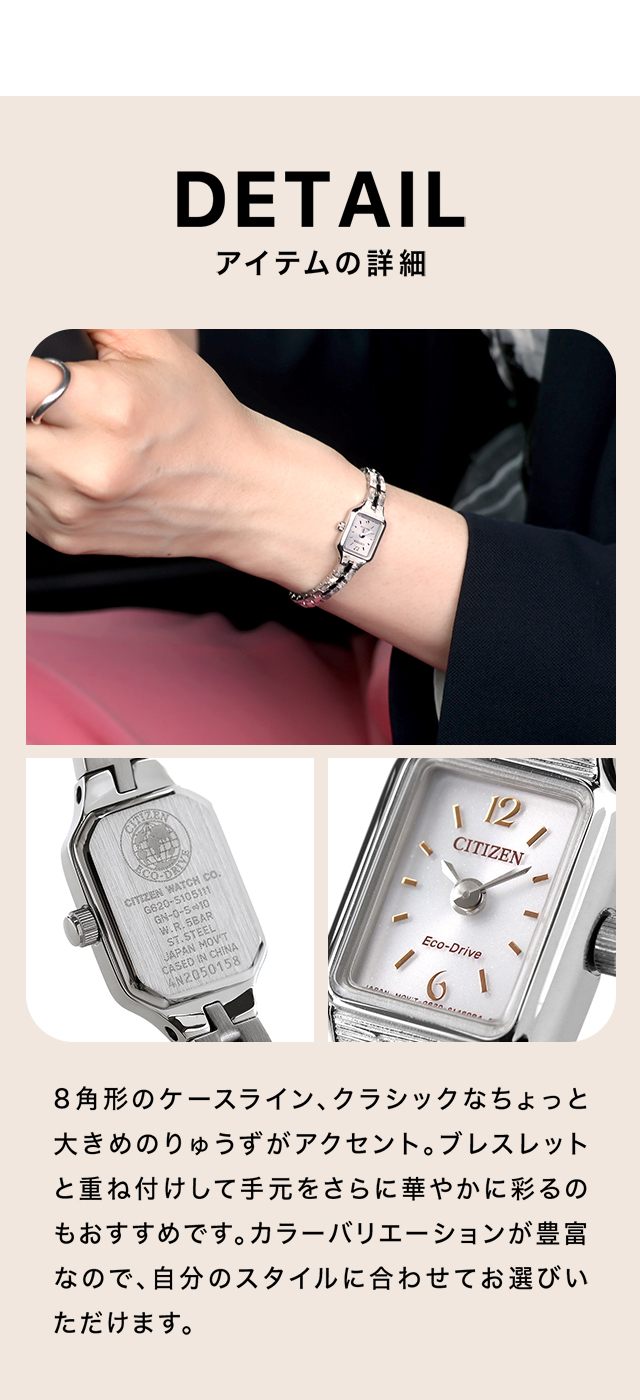 正規品 7年保証キャンペーン 送料無料 シチズン キー スクエア メタルブレス ソーラー レディース 腕時計 CITIZEN Kii アナログ 選べるモデル ◆アンティークなデザインでエコ・ドライブという機能性も併せ持つ、 シチズン Kii:(キー)。極小ムーブメントを採用することで、よりアクセサリー感の強いアンティークテイストを楽しむことができます。8角形のケースライン、クラシックなちょっと大きめのりゅうずがアクセント。カラーバリエーションが豊富なので、自分のスタイルに合わせてお選びいただけます。小ぶりで華奢なスタイルは、アクセサリー感覚で身に着けることが出来ます。 EG2043-57A EG2040-55A EG2042-50A