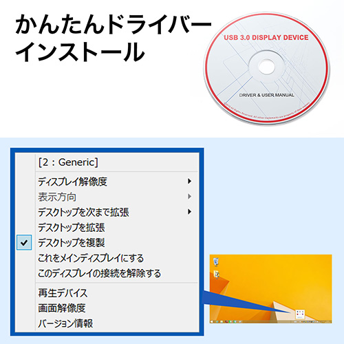 - リモートワークにモニターを2台購入し WIN10のVaio Z で利用するため、いろいろついているドッキングステーションも気になりましたが 予算と目的に見合った商品を購入すべく いろいろ探して安心できるサンワサプライさんにしました。 PC直接のバスパワー駆動でコンパクト。 USBを1口潰さずにHDMIとUSBポートにもなります 解像度も高く、PCのスペックもあり、グラボもそこそこ高性能なので画面遷移もいいです。 PCがネットにつながっていれば 専用ドライバーは、サンワサプライさんのサイトに行くとダウンロードができます。