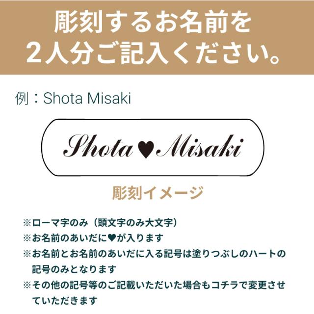 「記入欄」へご記入ください。 ■ふたりのお名前を彫刻します。 例: Shota Misaki ■ローマ字のみ、頭文字大文字、それ以降は小文字となります ■お名前の間にハートマークがはいります。 上記の表記以外(日本語、すべて大文字、小文字)になっていた場合は 当店で変更させていただく場合がございます。 |